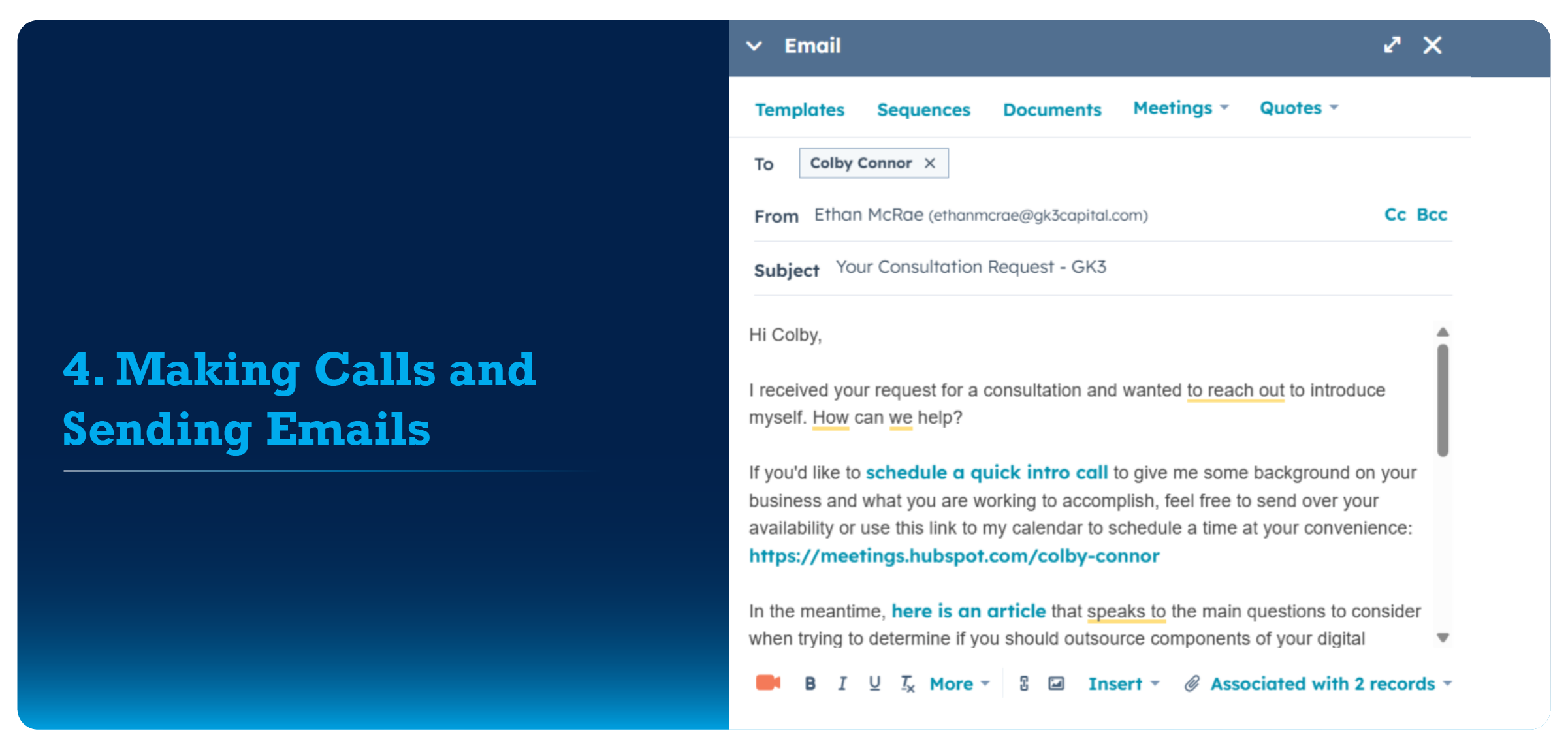 This is where meaningful conversations happen. HubSpot’s CRM allows you to make calls and send emails directly within the platform while keeping everything logged and organized. Here’s how: